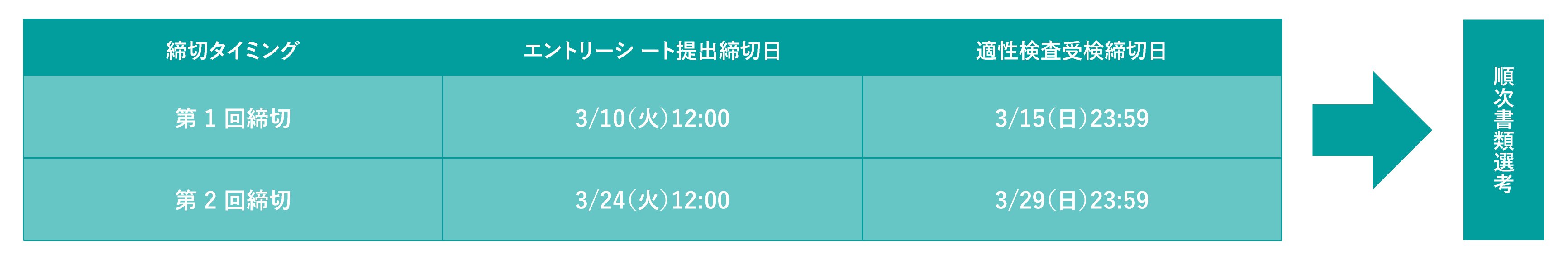 エントリーシートの提出・適性検査の受検をもってエントリー完了となります。 順次、書類選考を実施しますので、第1回締切でのご応募をお勧めします!